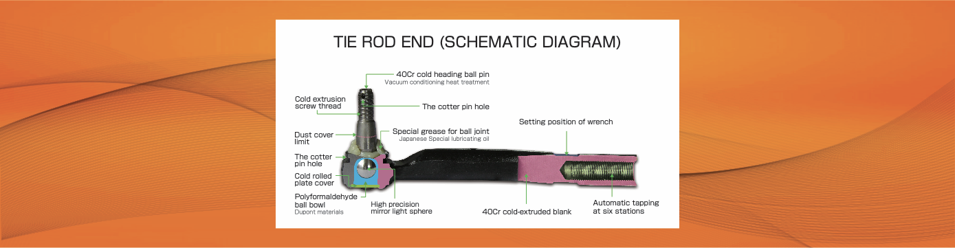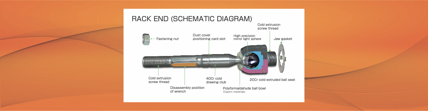 Rack End:The draw-in bar ball head seat material adopts 20Cr cold extrusion process for one-time forming, the tie rod ball pin adopts 40Cr cold drawing process for precision processing, the ball cup is made of a Japanese special material, and the ball head lubricant adopts Japanese special grease.