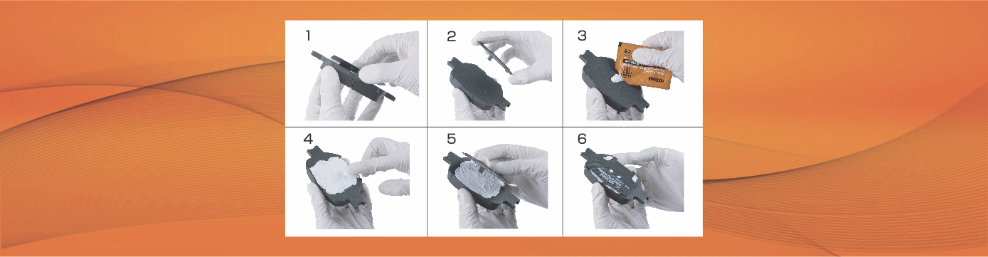 ■ Remove the noise reduction shims from the brake pads, open the anti-squeal paste, and apply a quarter of the paste evenly on the steel back. Reinstall the noise reduction shims afterward.