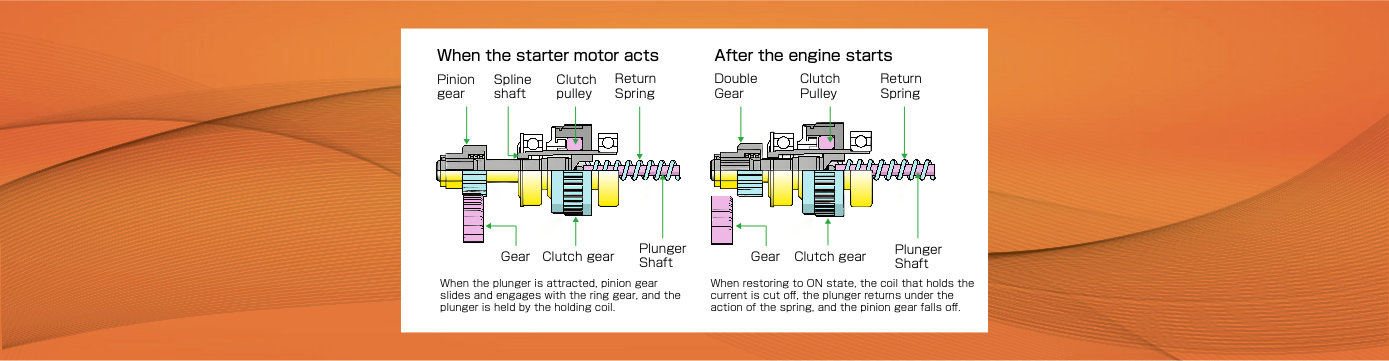 ■ The starter achieves the transmission of torque through the engagement of gear with flywheel, and thus drives the engine to reach to the normal speed of ignition. After the starter is powered off, the gear automatically disengages from the engine flywheel. At this time the engine ignites and enters normal operation, and the starter stops working.