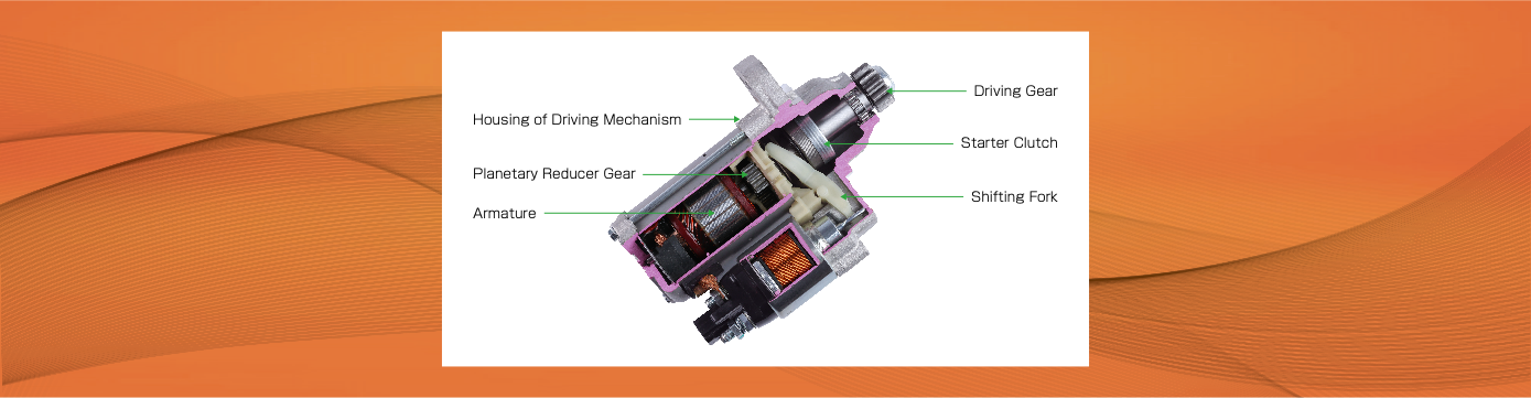 ■ DC motor is composed of DC series motor, control mechanism and clutch mechanism. It is specially used to start the engine and requires strong torque, so the current reaches to hundreds of amps.